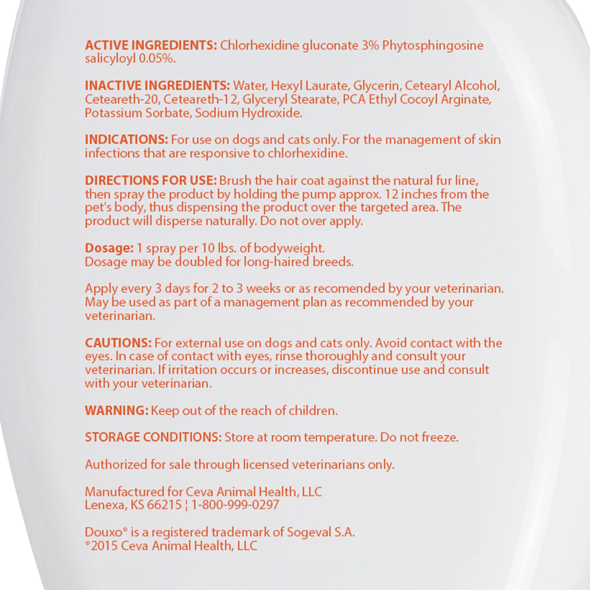 DOUXO Chlorhexidine Spray is an antiseptic spray used to manage skin infections that are responsive to chlorhexidine. DOUXO Chlorhexidine Micro-emulsion Spray is for the management of skin infections responsive to chlorhexidine. The fine mist spray is.