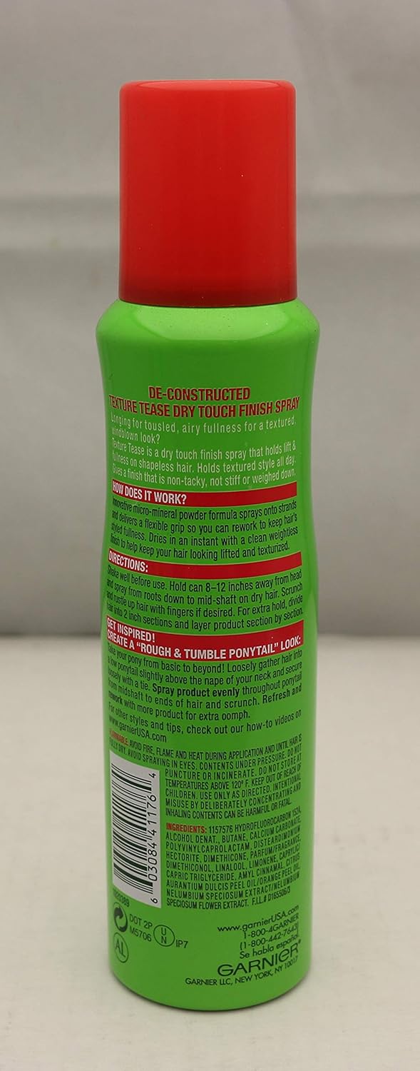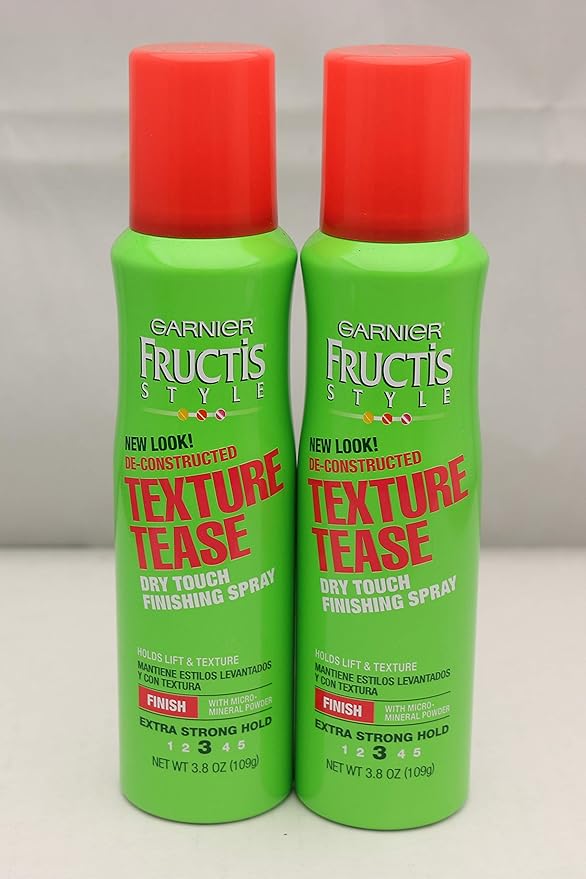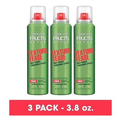 Garnier Fructis Style Texture Tease Dry Touch Finishing Spray is a hair texturizing spray that holds lift fullness on shapeless hair. Garnier Fructis Texture Tease Dry Touch Finishing Spray Dry touch finish flexible hairspray that holds lift fullness with no sticky weighdown 429 MSRP.