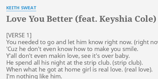 I used to think that I wasnt fine enough And I used to think that I wasnt wild enough But I wont waste my time tryna. Keyshia Cole Faith Evans Both And. Last Night Keyshia Cole Lyrics Single by Diddy featuring Keyshia Cole from the album Press Play and Just like You Released 16 February 2007 Recorded 2006 Label Bad BoyAtlantic Songwriters Sean CombsKeyshia ColeJack KnightMario WinansShannon Slam Lawrence. Keyshia Cole- Take Me AwayAlbum- Calling All HeartsKeyshia Cole- Take Me awayAlbum- Calling All HeartsKeyshia Cole. I love my baby I love my baby Sooo reaaaaady I love my baby I love my baby Well this a new hit for the radio radio Just another dance for the dancefloor dancefloor I really get it in if you didnt know didnt know I gotta whole lot and they dont know Break bread if you want to want to Cause leaving you is what I wont do do. Thanks to Raquesha for adding these lyrics. No I just couldnt see what I needed for me.