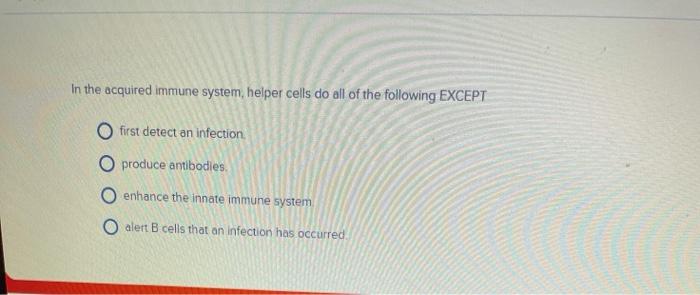 In the acquired immune systemhelper cells do all of the following except. Enhance the innate immune system. T Cell Both adaptive and innate immunity. In the acquired immune system helper T cells do all of the following tasks EXCEPT A enhance the innate immune system.